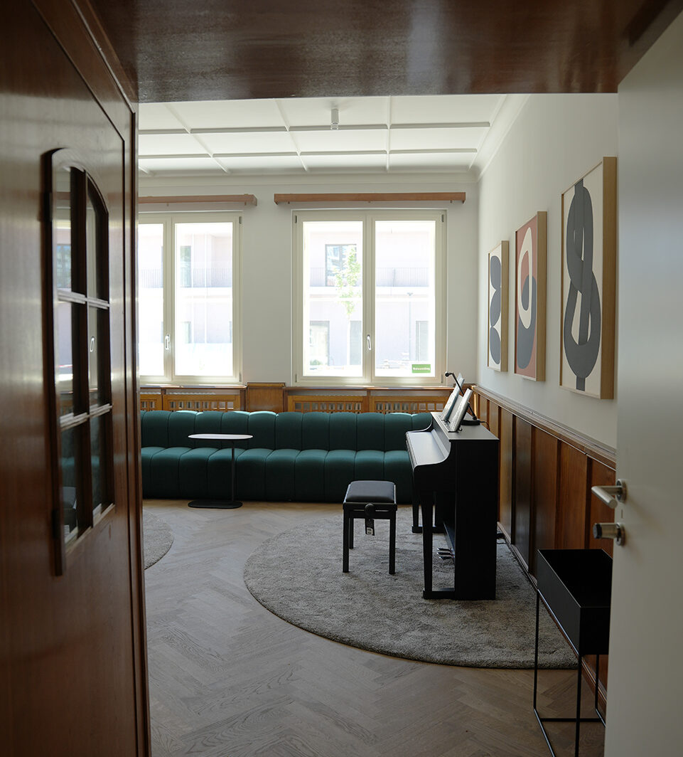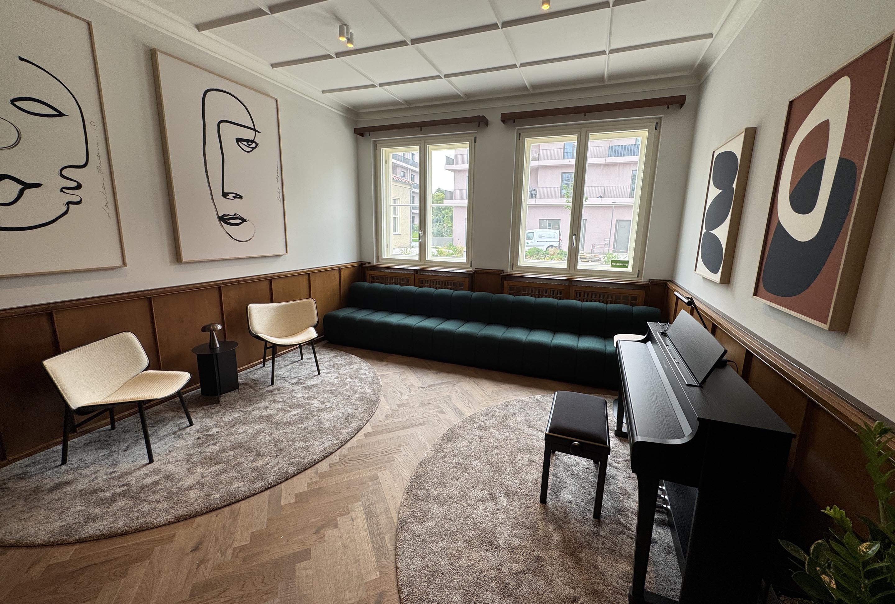 Der Piano Room vereint stilvolles Ambiente mit musikalischem Flair. Das Klavier lädt zum Spielen ein, während die grüne Couch, warme Holzvertäfelungen und moderne Kunstwerke für eine entspannte Atmosphäre sorgen. Ob für kleine musikalische Sessions, persönliche Begegnungen oder kreative Auszeiten – hier entstehen besondere Momente. Der Piano Room kann auch mit anderen Räumen von qnorke kombiniert werden.